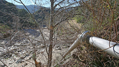 "That's Arrowhead's pipe coming down right there." said Gary Earney, a retired Forest Service employee, standing on the bank of the creek and leaning on a walking stick. Earney used to administer permits for the Forest Service, and he said the agency has never done an assessment of how the taking of water affects the creek. Back when the water pipes were installed in the early 20th